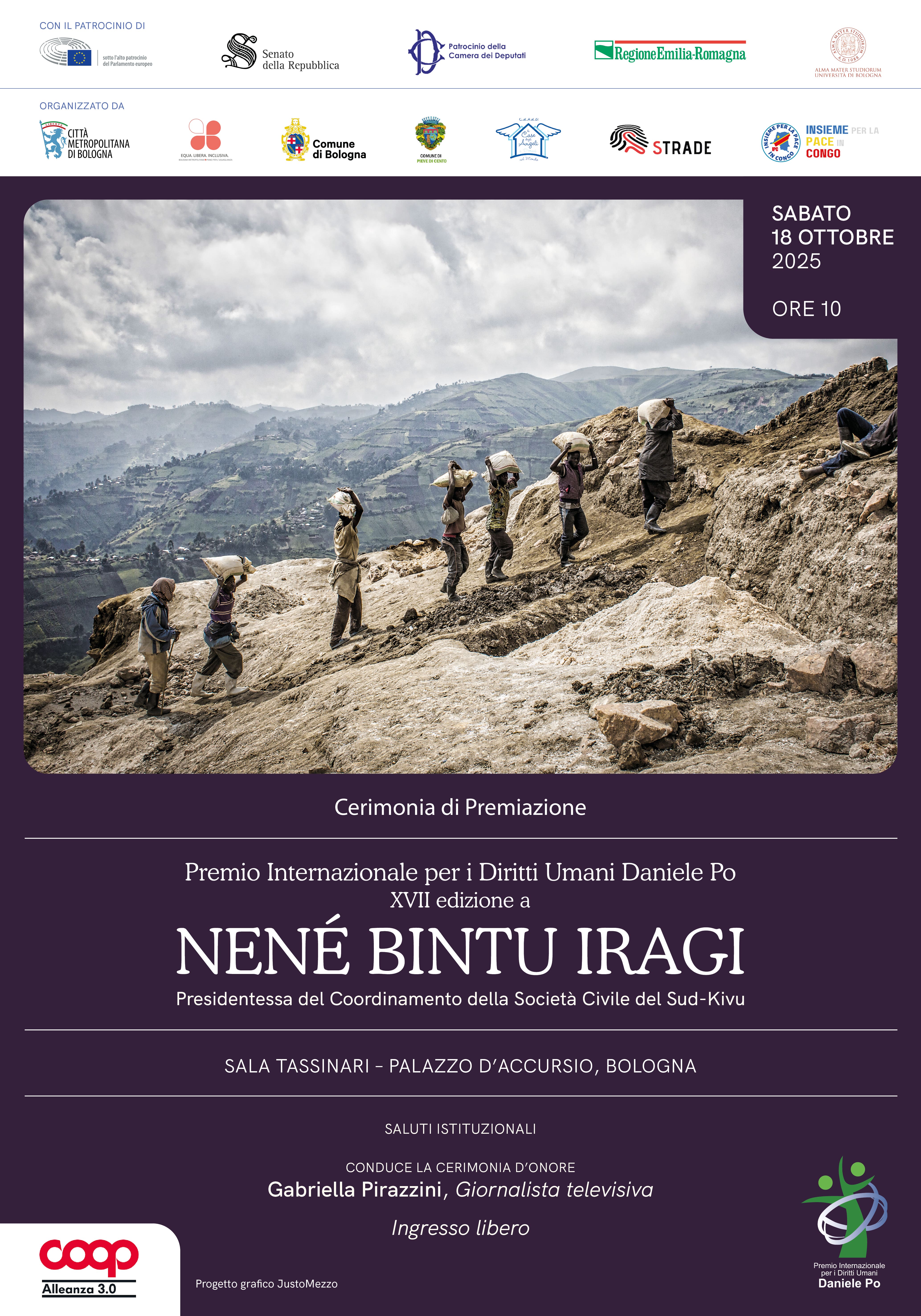 Per l'edizione 2025 del Premio giunta alla 17° edizione il comitato scientifico ha designato come vincitrice Nenè Bintu Iragi, avvocato e presidentessa della Rete delle associazioni per i diritti del Sud Kivu, attiva per la difesa di diritti umani nella Repubblica Democratica del Congo, paese in guerra da 30 anni. Esule in Burundi per minacce di morte, la Premiata porterà a Cento a studenti e privati cittadini la sua testimonianza in favore di diritti di donne e bambini sfruttati ogni giorno dai padroni della guerra e dei diamanti La premiata incarna la forza di chi non tace davanti alle ingiustizie, lottando per la pace e l’uguaglianza di genere nella Repubblica Democratica del Congo. La sua testimonianza richiama il dovere di rompere il silenzio sulle guerre dimenticate e di promuovere consapevolezza sulle profonde ferite sociali, economiche e umane che derivano dal controllo delle risorse naturali. In un periodo storico come quello che stiamo vivendo, la voce di Nené Bintu Iragi risuona come un richiamo potente alle nostre coscienze, ricordandoci che la difesa dei diritti umani fondamentali è un impegno collettivo di tutti i popoli, di tutti gli esseri umani.